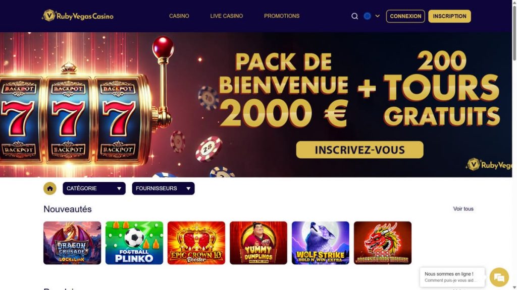 Ruby Vegas est le casino idéal pour les amateurs de machines à sous et de jackpots progressifs. Avec 50 tours gratuits offerts dès l’inscription et un bonus sur le deuxième dépôt, il permet de démarrer l’aventure en beauté. Le dépôt minimum de 10 € le rend accessible à tous.